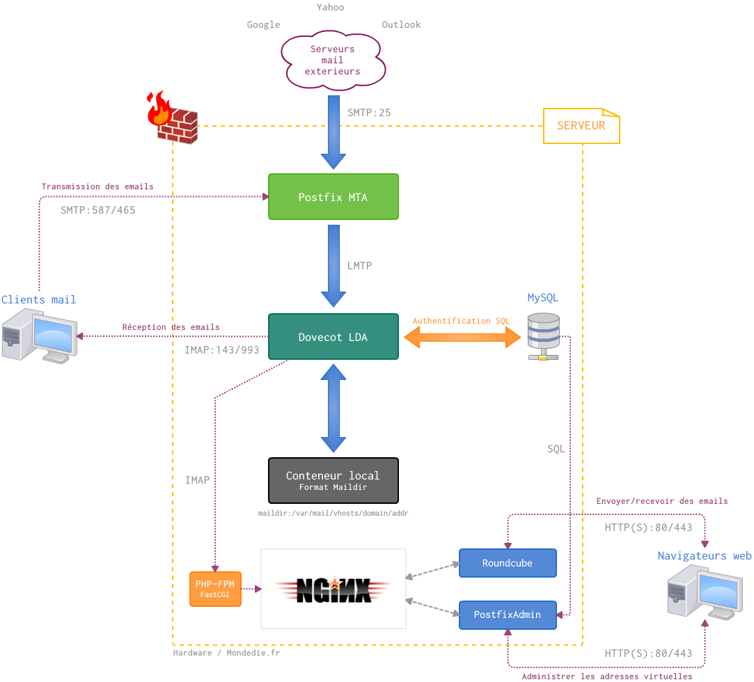 cp /etc/postfix/main.cf /etc/postfix/main.cf.bak Ce fichier de configuration est assez complexe, on va voir ensemble comment le configurer correctement. J'ai séparé par bloc de configuration pour que ça soit plus facile à comprendre. Vous retrouverez à la fin de cette section l'ensemble de la configuration de Postfix, n'hésitez pas à faire un diff avec le votre pour voir si vous n'avez pas fait d'erreur.